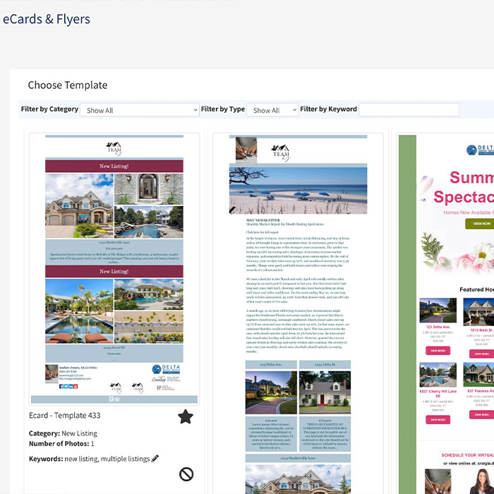 What would any website or CRM be without Marketing? The JET Platform Agent Marketing Center will help you engage the consumer on social media, email, text, or through traditional mail with postcards and flyers.